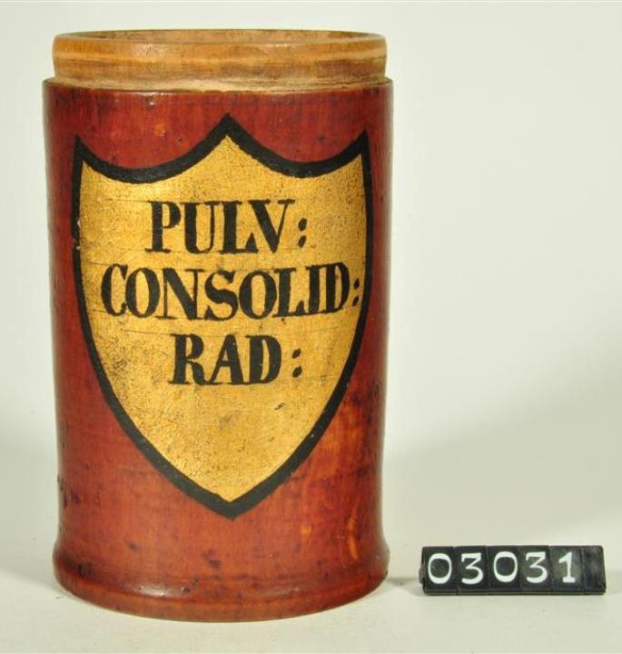 Braune, zylinderförmige Holzdose (Holzbüchse) mit ausgestelltem Standfuß ohne Deckel. Auf der Schauseite schildförmiges und goldfarbenes Beschriftungsfeld mit schwarzem Rand. Schwarz signiert