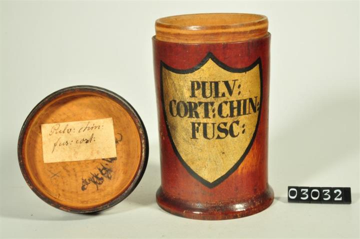 Braune, zylinderförmige Holzdose (Holzbüchse) mit ausgestelltem Standfuß und eingepaßtem, flachem Stülpdeckel und nach außen gebogenem Profil. Auf der Schauseite schildförmiges und goldfarbenes Beschriftungsfeld mit schwarzem Rand. Schwarz signiert