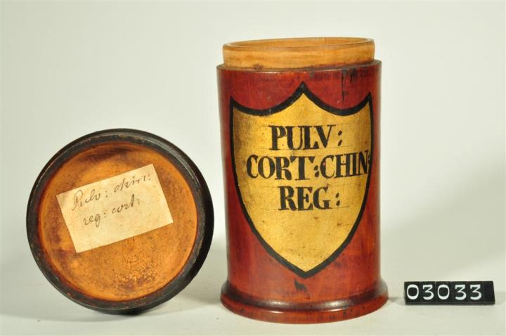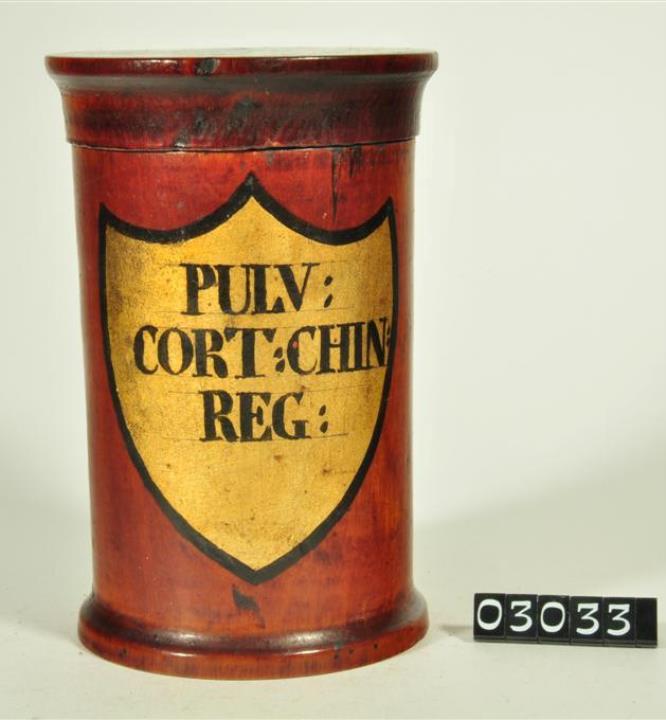 Braune, zylinderförmige Holzdose (Holzbüchse) mit ausgestelltem und abgesetztem Standfuß und eingepaßtem, flachem Stülpdeckel und nach außen gebogenem Profil. Auf der Schauseite schildförmiges und goldfarbenes Beschriftungsfeld mit schwarzem Rand. Schwarz signiert