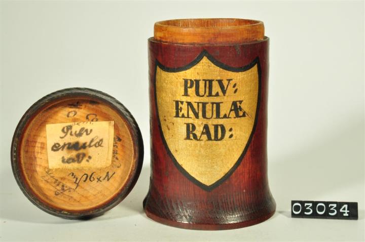 Braune, zylinderförmige Holzdose (Holzbüchse) mit ausgestelltem Standfuß und eingepaßtem, flachem Stülpdeckel und nach außen gebogenem Profil. Auf der Schauseite schildförmiges und goldfarbenes Beschriftungsfeld mit schwarzem Rand. Schwarz signiert