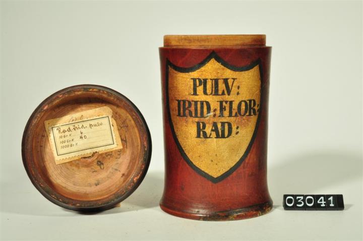 Braune, konische Holzdose (Holzbüchse) mit ausgestelltem und abgesetztem Standfuß und eingepaßtem, flachem Stülpdeckel und nach außen gebogenem Profil. Auf der Schauseite schildförmiges und goldfarbenes Beschriftungsfeld mit schwarzem Rand. Schwarz signiert