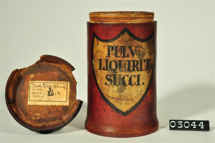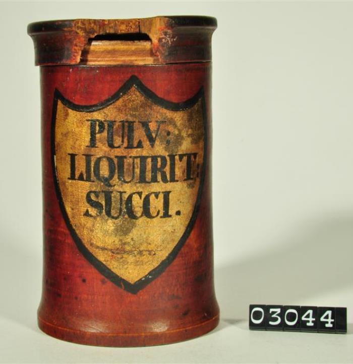 Braune, zylinderförmige Holzdose (Holzbüchse) mit ausgestelltem Standfuß und eingepaßtem, flachem Stülpdeckel und nach außen gebogenem Profil. Auf der Schauseite schildförmiges und goldfarbenes Beschriftungsfeld mit schwarzem Rand. Schwarz signiert