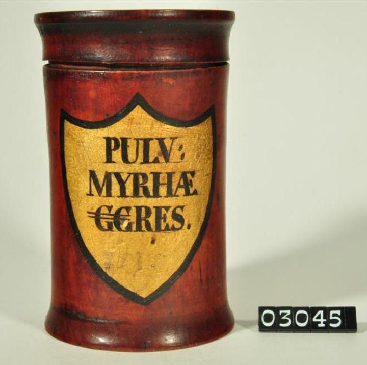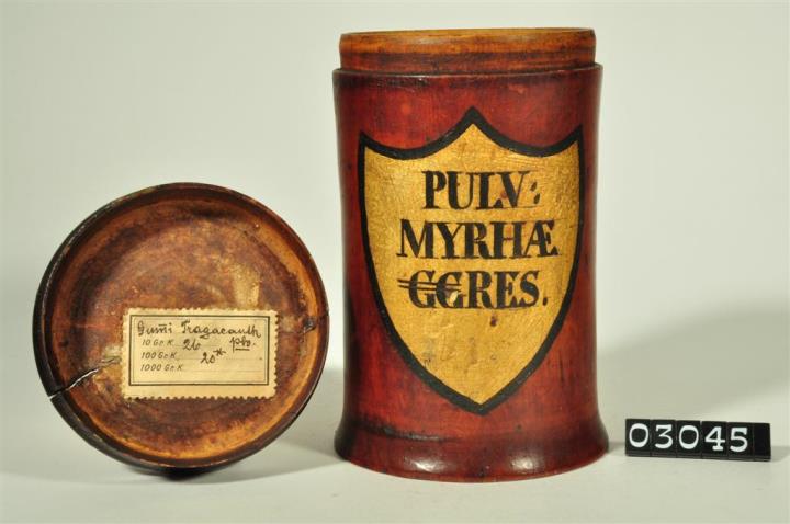 Braune, zylinderförmige Holzdose (Holzbüchse) mit ausgestelltem Standfuß und eingepaßtem, flachem Stülpdeckel und nach außen gebogenem Profil. Auf der Schauseite schildförmiges und goldfarbenes Beschriftungsfeld mit schwarzem Rand. Schwarz signiert