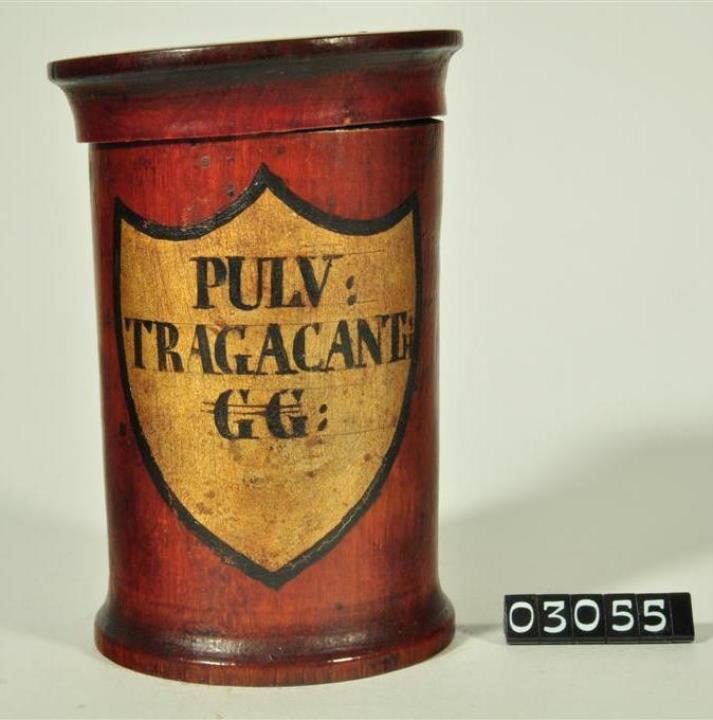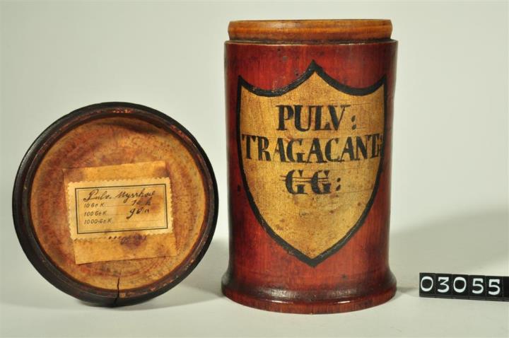 Braune, zylinderförmige Holzdose (Holzbüchse) mit ausgestelltem, abgesetztem Standfuß und eingepaßtem, flachem Stülpdeckel und nach außen gebogenem Profil. Auf der Schauseite schildförmiges und goldfarbenes Beschriftungsfeld mit schwarzem Rand. Schwarz signiert