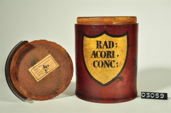 Braune, zylinderförmige Holzdose (Holzbüchse) mit ausgestelltem Standfuß und eingepaßtem, flachem Stülpdeckel und nach außen gebogenem Profil. Auf der Schauseite schildförmiges und goldfarbenes Beschriftungsfeld mit schwarzem Rand. Schwarz signiert