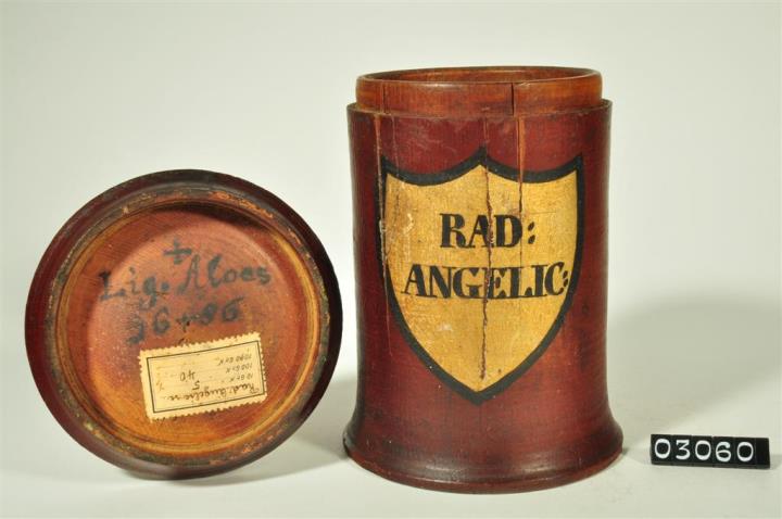 Braune, zylinderförmige Holzdose (Holzbüchse) mit ausgestelltem Standfuß und eingepaßtem, flachem Stülpdeckel und nach außen gebogenem Profil. Auf der Schauseite schildförmiges und goldfarbenes Beschriftungsfeld mit schwarzem Rand. Schwarz signiert