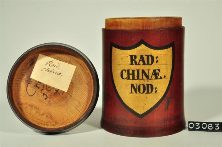 Braune, zylinderförmige Holzdose (Holzbüchse) mit ausgestelltem Standfuß und eingepaßtem, flachem Stülpdeckel und nach außen gebogenem Profil. Auf der Schauseite schildförmiges und goldfarbenes Beschriftungsfeld mit schwarzem Rand. Schwarz signiert