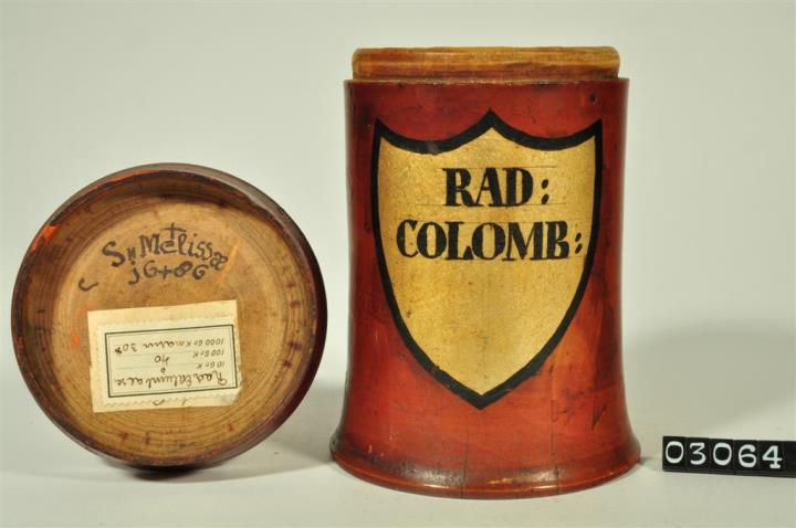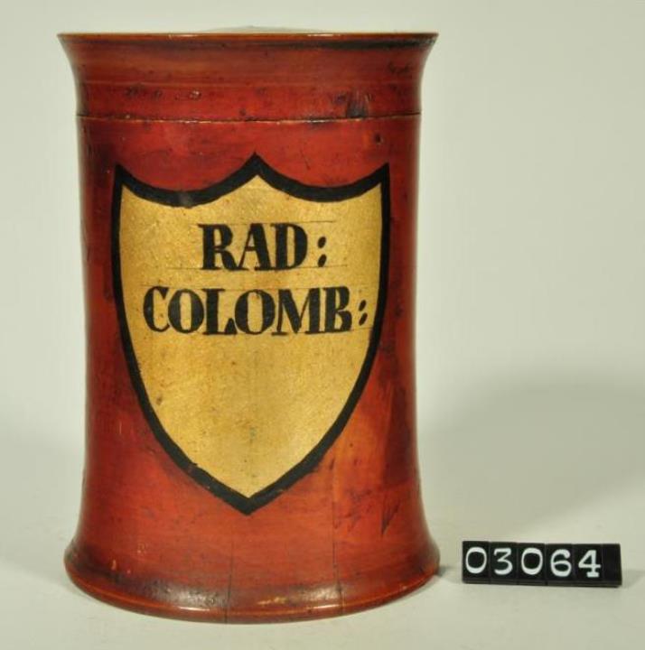 Braune, zylinderförmige Holzdose (Holzbüchse) mit ausgestelltem Standfuß und eingepaßtem, flachem Stülpdeckel und nach außen gebogenem Profil. Auf der Schauseite schildförmiges und goldfarbenes Beschriftungsfeld mit schwarzem Rand. Schwarz signiert