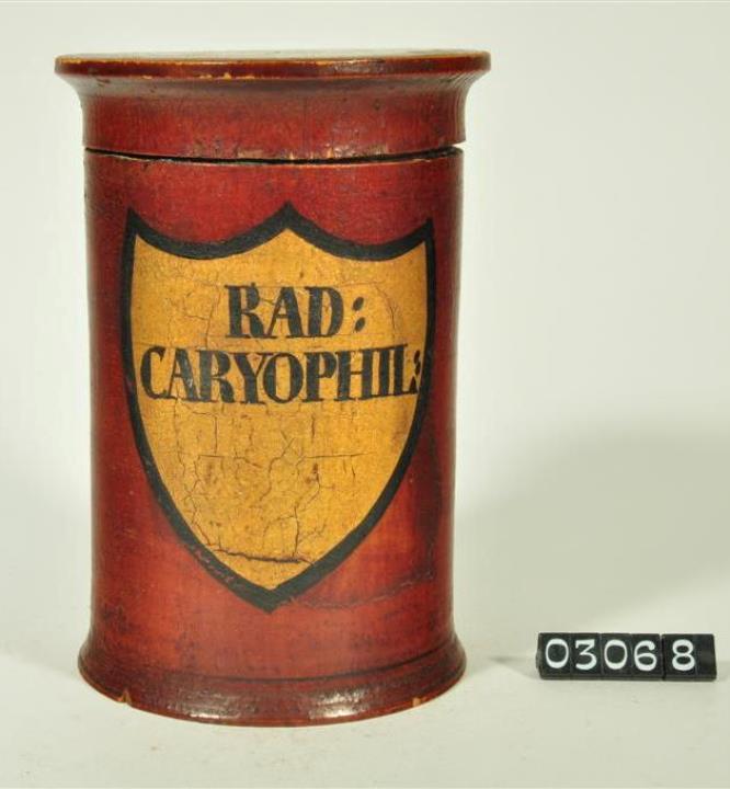 Braune, zylinderförmige Holzdose (Holzbüchse) mit ausgestelltem Standfuß und eingepaßtem, kaum gewölbtem Stülpdeckel und nach außen gebogenem Profil. Auf der Schauseite schildförmiges und goldfarbenes Beschriftungsfeld mit schwarzem Rand. Schwarz signiert