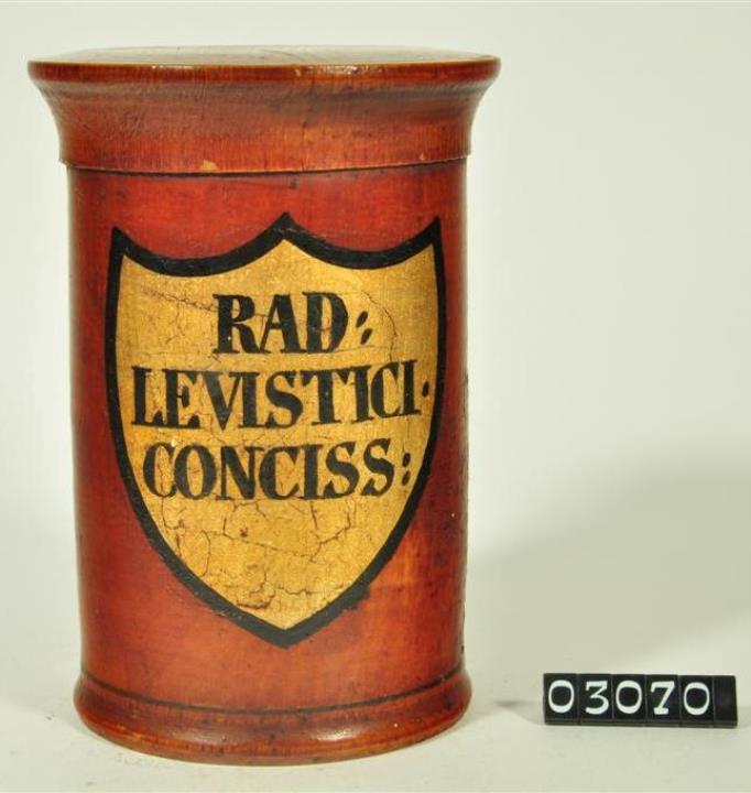 Braune, zylinderförmige Holzdose (Holzbüchse) mit ausgestelltem, abgesetztem Standfuß und eingepaßtem, kaum gewölbtem Stülpdeckel und nach außen gebogenem Profil. Auf der Schauseite schildförmiges und goldfarbenes Beschriftungsfeld mit schwarzem Rand. Schwarz signiert