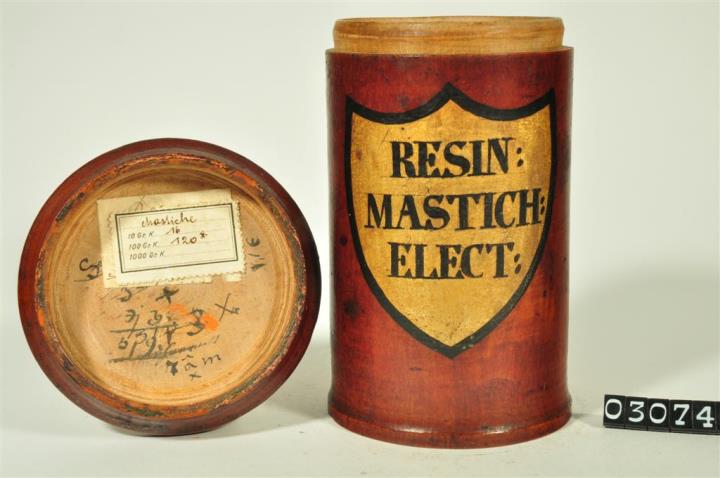 Braune, zylinderförmige Holzdose (Holzbüchse) mit abgesetztem Standfuß und eingepaßtem, flachem Stülpdeckel und nach außen gebogenem Profil. Auf der Schauseite schildförmiges und goldfarbenes Beschriftungsfeld mit schwarzem Rand. Schwarz signiert. Enthielt Mastix