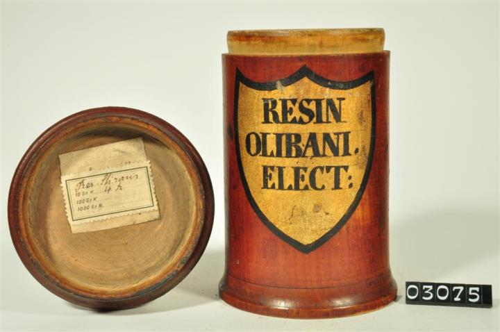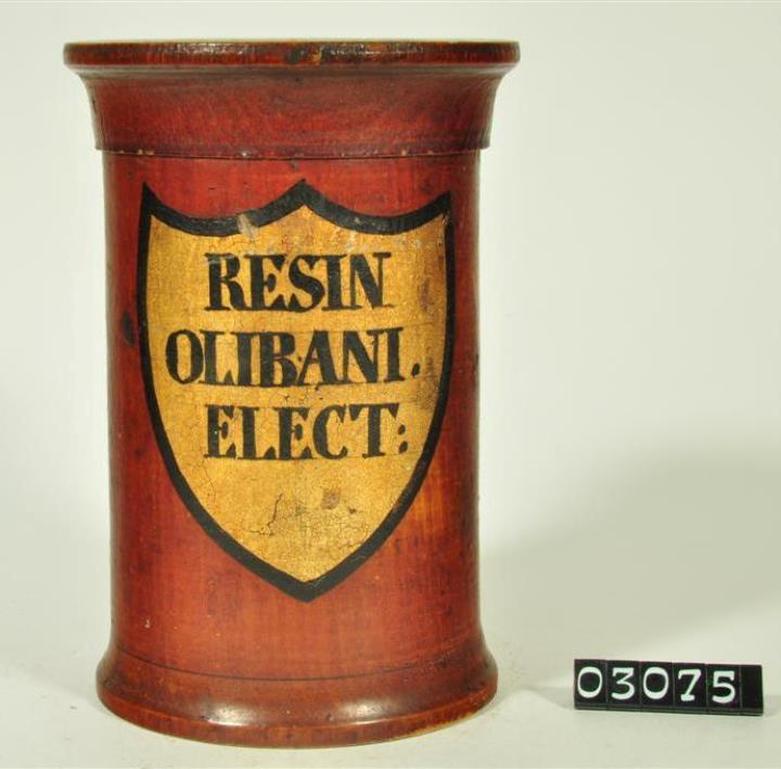 Braune, zylinderförmige Holzdose (Holzbüchse) mit ausgestelltem Standfuß und eingepaßtem, flachem Stülpdeckel und nach außen gebogenem Profil. Auf der Schauseite schildförmiges und goldfarbenes Beschriftungsfeld mit schwarzem Rand. Schwarz signiert