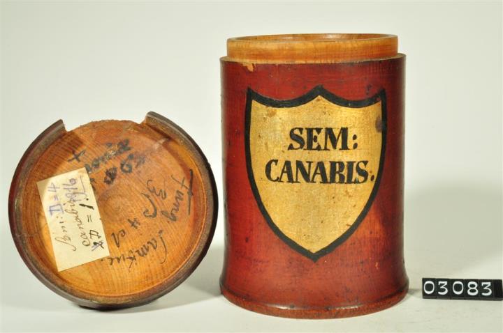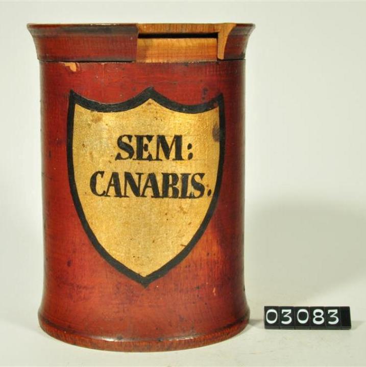 Braune, zylinderförmige Holzdose (Holzbüchse) mit ausgestelltem Standfuß und eingepaßtem, flachem Stülpdeckel und nach außen gebogenem Profil. Deckel wurde 1686 umsigniert. Auf der Schauseite schildförmiges und goldfarbenes Beschriftungsfeld mit schwarzem Rand. Schwarz signiert.