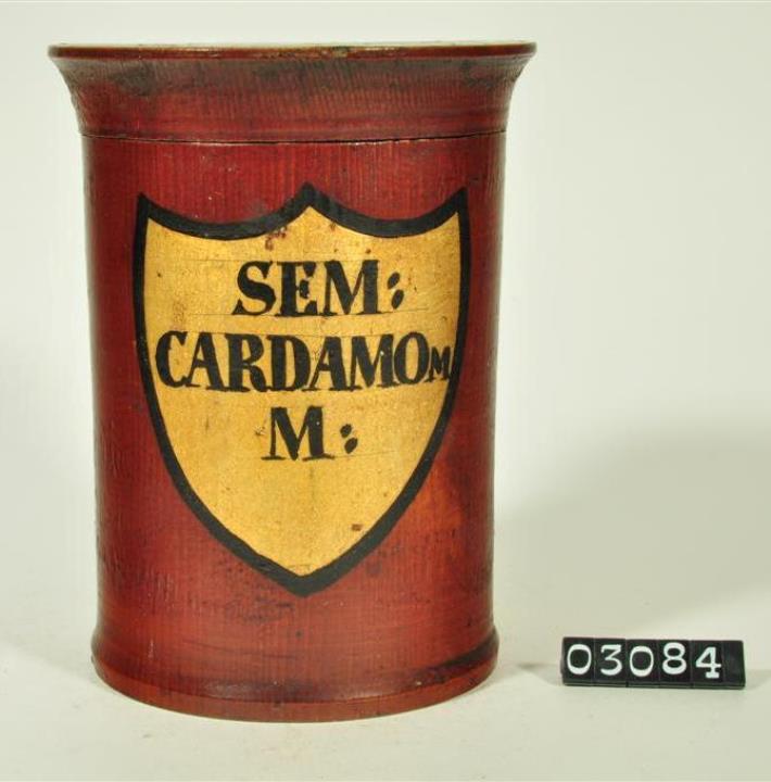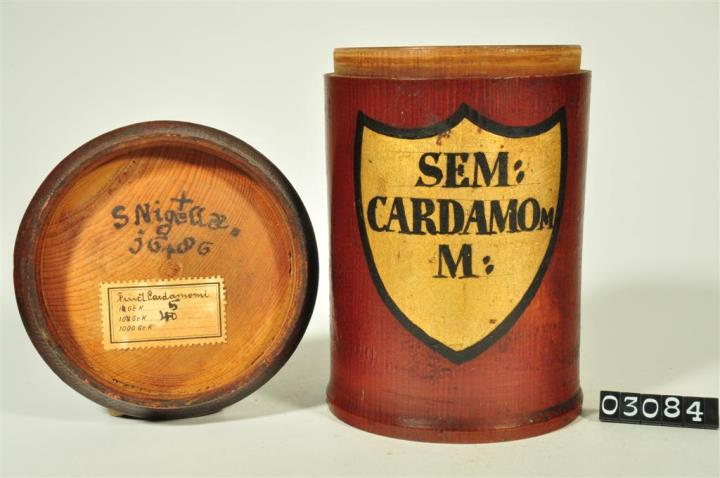Braune, zylinderförmige Holzdose (Holzbüchse) mit abgesetztem Standfuß und eingepaßtem, flachem Stülpdeckel und nach außen gebogenem Profil. Auf der Schauseite schildförmiges und goldfarbenes Beschriftungsfeld mit schwarzem Rand. Schwarz signiert