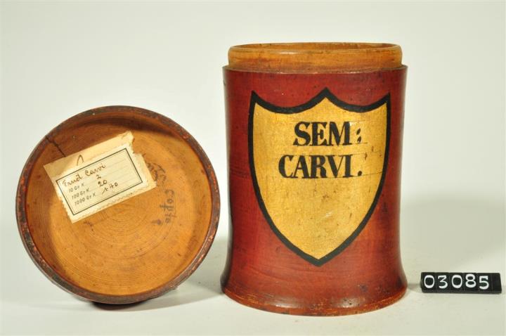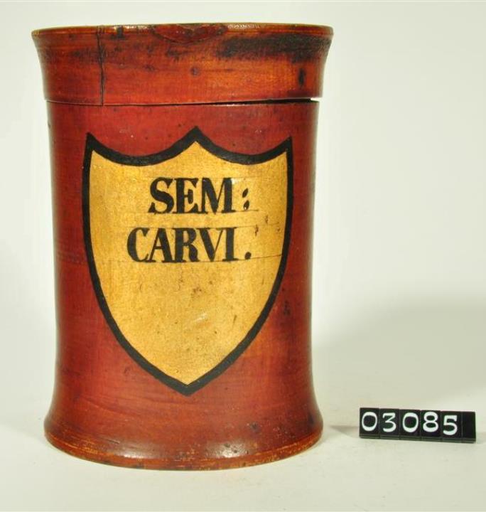 Braune, zylinderförmige Holzdose (Holzbüchse) mit ausgestelltem Standfuß und eingepaßtem, flachem Stülpdeckel und nach außen gebogenem Profil. Auf der Schauseite schildförmiges und goldfarbenes Beschriftungsfeld mit schwarzem Rand. Schwarz signiert