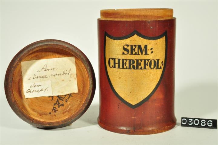 Braune, zylinderförmige Holzdose (Holzbüchse) mit abgesetztem Standfuß und eingepaßtem, flachem Stülpdeckel und nach außen gebogenem Profil. Auf der Schauseite schildförmiges und goldfarbenes Beschriftungsfeld mit schwarzem Rand. Schwarz signiert