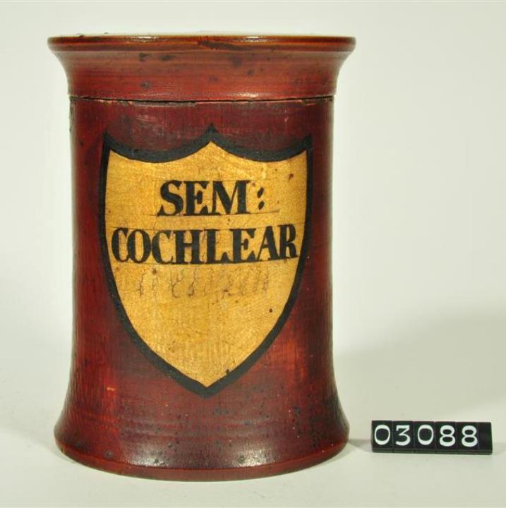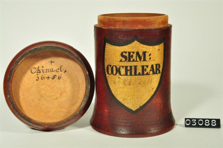 Braune, zylinderförmige Holzdose (Holzbüchse) mit ausgestelltem Standfuß und eingepaßtem, flachem Stülpdeckel und nach außen gebogenem Profil. Auf der Schauseite schildförmiges und goldfarbenes Beschriftungsfeld mit schwarzem Rand. Schwarz signiert