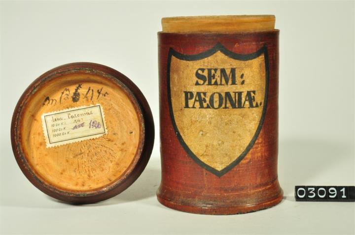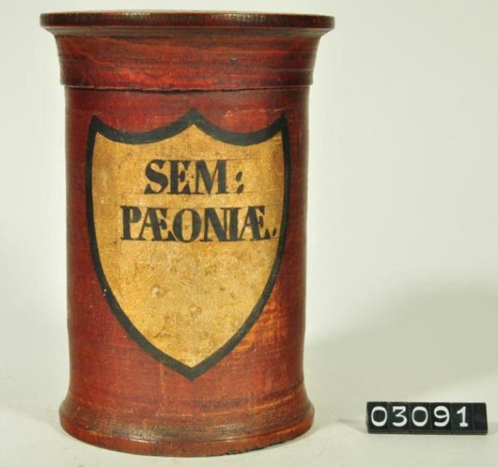 Braune, zylinderförmige Holzdose (Holzbüchse) mit ausgestelltem Standfuß und eingepaßtem, flachem Stülpdeckel und nach außen gebogenem Profil. Auf der Schauseite schildförmiges und goldfarbenes Beschriftungsfeld mit schwarzem Rand. Schwarz signiert