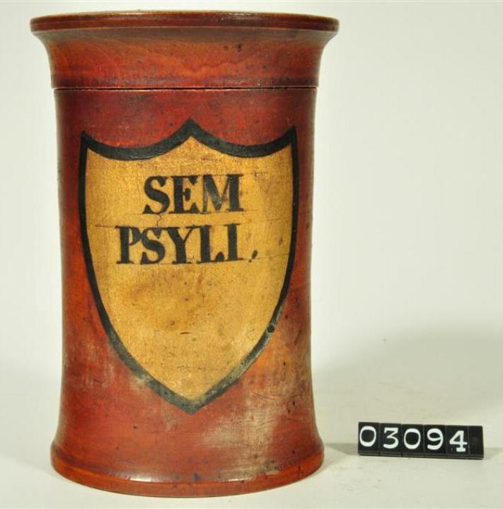 Braune, zylinderförmige Holzdose (Holzbüchse) mit ausgestelltem Standfuß und eingepaßtem, flachem Stülpdeckel und nach außen gebogenem Profil. Auf der Schauseite schildförmiges und goldfarbenes Beschriftungsfeld mit schwarzem Rand. Schwarz signiert