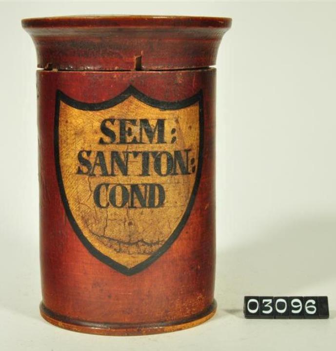 Braune, zylinderförmige Holzdose (Holzbüchse) mit abgesetztem Standfuß und eingepaßtem, flachem Stülpdeckel und nach außen gebogenem Profil. Auf der Schauseite schildförmiges und goldfarbenes Beschriftungsfeld mit schwarzem Rand. Schwarz signiert
