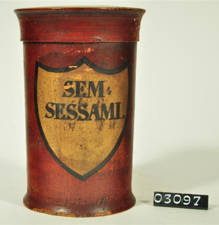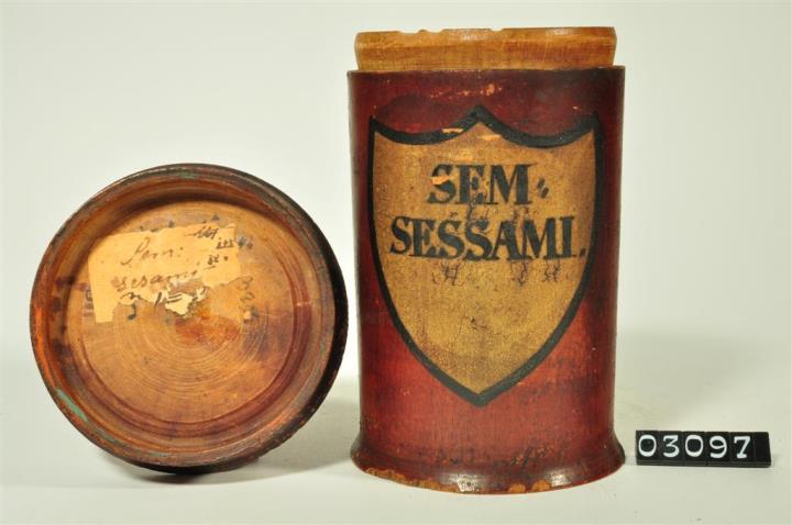 Braune, zylinderförmige Holzdose (Holzbüchse) mit ausgebogenem Standfuß und eingepaßtem, flachem Stülpdeckel und nach außen gebogenem Profil. Auf der Schauseite schildförmiges und goldfarbenes Beschriftungsfeld mit schwarzem Rand. Schwarz signiert