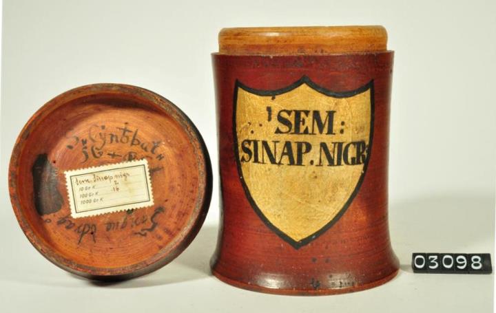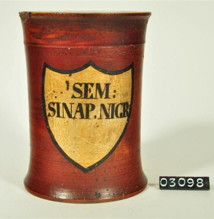Braune, zylinderförmige Holzdose (Holzbüchse) mit ausgestelltem Standfuß und eingepaßtem, flachem Stülpdeckel und nach außen gebogenem Profil. Auf der Schauseite schildförmiges und goldfarbenes Beschriftungsfeld mit schwarzem Rand. Schwarz signiert