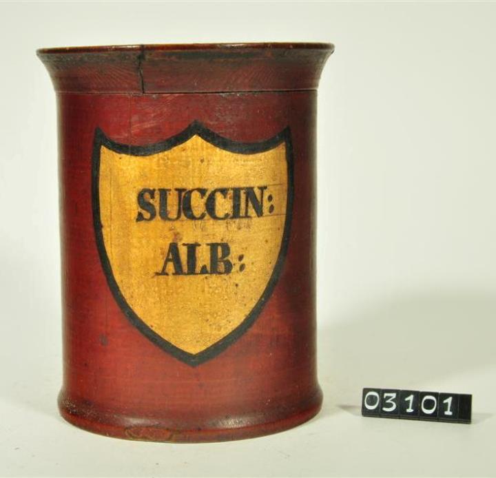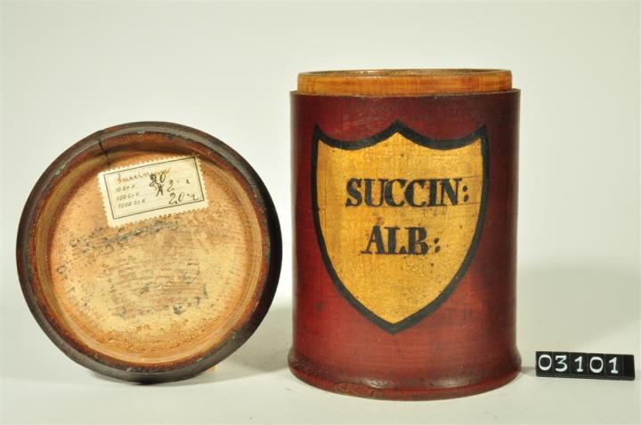 Braune, zylinderförmige Holzdose (Holzbüchse) mit ausgebogenem, abgesetztem Standfuß und eingepaßtem, flachem Stülpdeckel und nach außen gebogenem Profil. Auf der Schauseite schildförmiges und goldfarbenes Beschriftungsfeld mit schwarzem Rand. Schwarz signiert