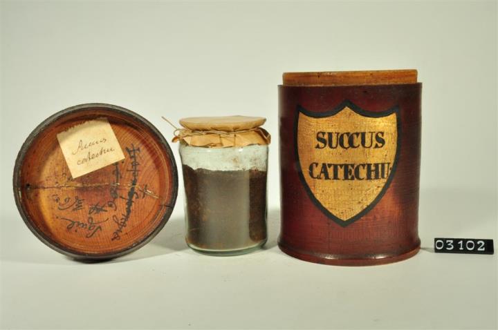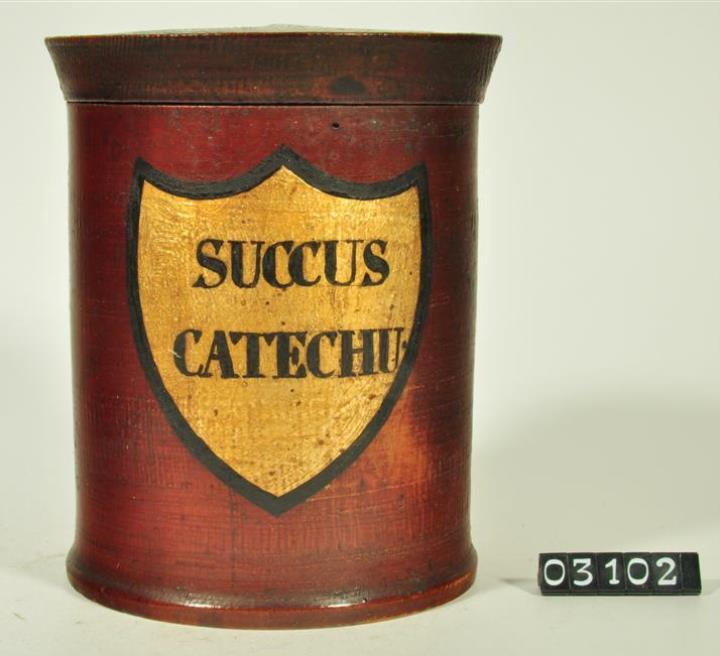 Braune, zylinderförmige Holzdose (Holzbüchse) mit ausgebogenem, abgesetztem Standfuß und eingepaßtem, kaum gewölbtem Stülpdeckel und nach außen gebogenem Profil. Auf der Schauseite schildförmiges und goldfarbenes Beschriftungsfeld mit schwarzem Rand. Schwarz signiert