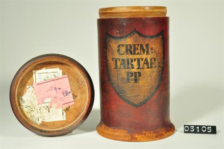 Braune, zylinderförmige Holzdose (Holzbüchse) mit ausgestelltem Standfuß und eingepaßtem, flachem Stülpdeckel und nach außen gebogenem Profil. Auf der Schauseite schildförmiges und goldfarbenes Beschriftungsfeld mit schwarzem Rand. Schwarz signiert