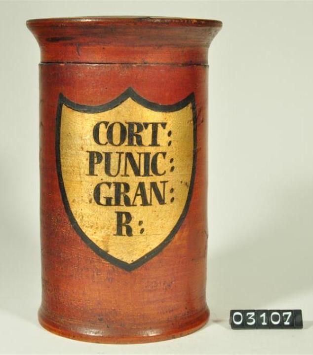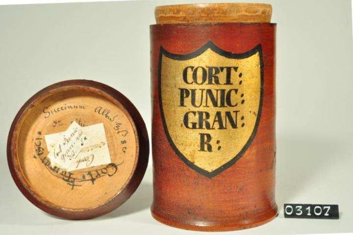 Braune, zylinderförmige Holzdose (Holzbüchse) mit abgesetztem Standfuß und eingepaßtem, kaum gewölbtem Stülpdeckel und nach außen gebogenem Profil. Auf der Schauseite schildförmiges und goldfarbenes Beschriftungsfeld mit schwarzem Rand. Schwarz signiert. Enthielt die Rinde des Granatbaumes, welche als Bandwurmmittel verwendet wurde.