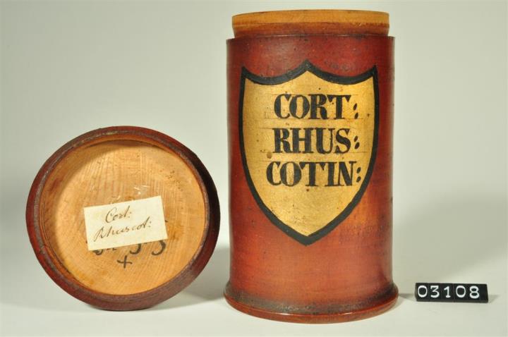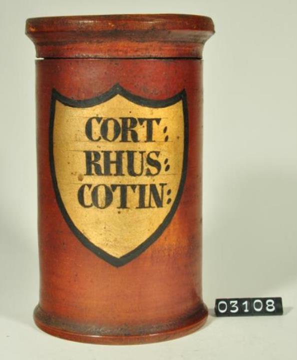 Braune, zylinderförmige Holzdose (Holzbüchse) mit abgesetztem Standfuß und eingepaßtem, flachem Stülpdeckel und nach außen gebogenem Profil. Auf der Schauseite schildförmiges und goldfarbenes Beschriftungsfeld mit schwarzem Rand. Schwarz signiert