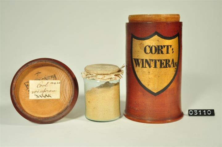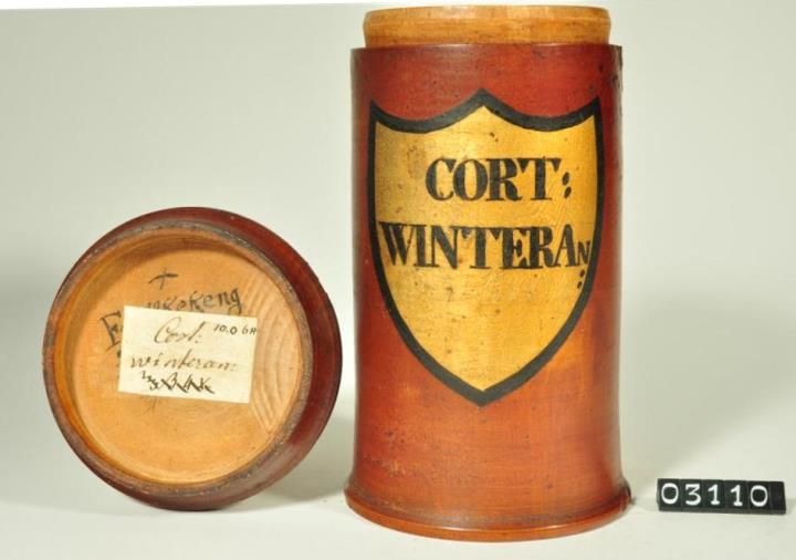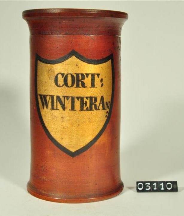 Braune, zylinderförmige Holzdose (Holzbüchse) mit abgesetztem Standfuß und eingepaßtem, flachem Stülpdeckel und nach außen gebogenem Profil. Auf der Schauseite schildförmiges und goldfarbenes Beschriftungsfeld mit schwarzem Rand. Schwarz signiert