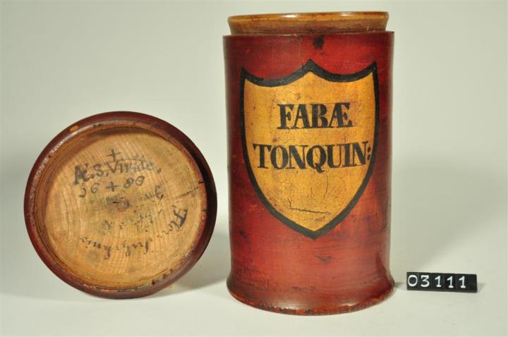 Braune, zylinderförmige Holzdose (Holzbüchse) mit ausgestelltem Standfuß und eingepaßtem, flachem Stülpdeckel und nach außen gebogenem Profil. Auf der Schauseite schildförmiges und goldfarbenes Beschriftungsfeld mit schwarzem Rand. Schwarz signiert