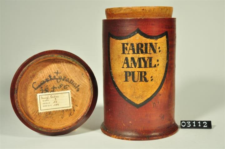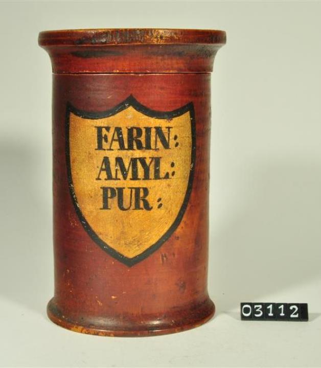 Braune, zylinderförmige Holzdose (Holzbüchse) mit ausgestelltem Standfuß und eingepaßtem, flachem Stülpdeckel und nach außen gebogenem Profil. Auf der Schauseite schildförmiges und goldfarbenes Beschriftungsfeld mit schwarzem Rand. Schwarz signiert