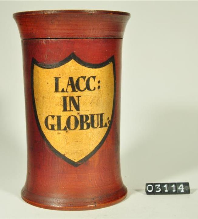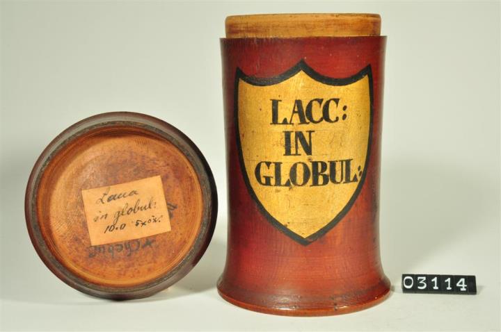 Braune, zylinderförmige Holzdose (Holzbüchse) mit ausgestelltem Standfuß und eingepaßtem, flachem Stülpdeckel und nach außen gebogenem Profil. Auf der Schauseite schildförmiges und goldfarbenes Beschriftungsfeld mit schwarzem Rand. Schwarz signiert