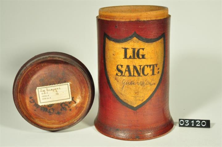 Braune, zylinderförmige Holzdose (Holzbüchse) mit ausgestelltem Standfuß und eingepaßtem, flachem Stülpdeckel und nach außen gebogenem Profil. Auf der Schauseite schildförmiges und goldfarbenes Beschriftungsfeld mit schwarzem Rand. Schwarz signiert