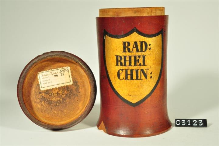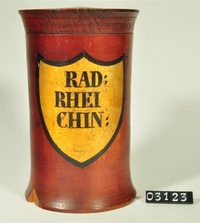 Braune, zylinderförmige Holzdose (Holzbüchse) mit ausgestelltem Standfuß und eingepaßtem, kaum gewölbtem Stülpdeckel und nach außen gebogenem Profil. Auf der Schauseite schildförmiges und goldfarbenes Beschriftungsfeld mit schwarzem Rand. Schwarz signiert