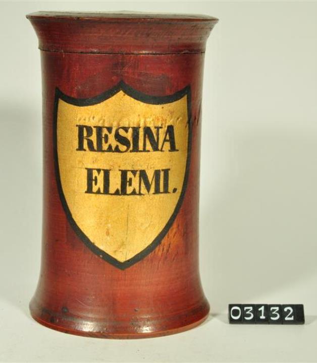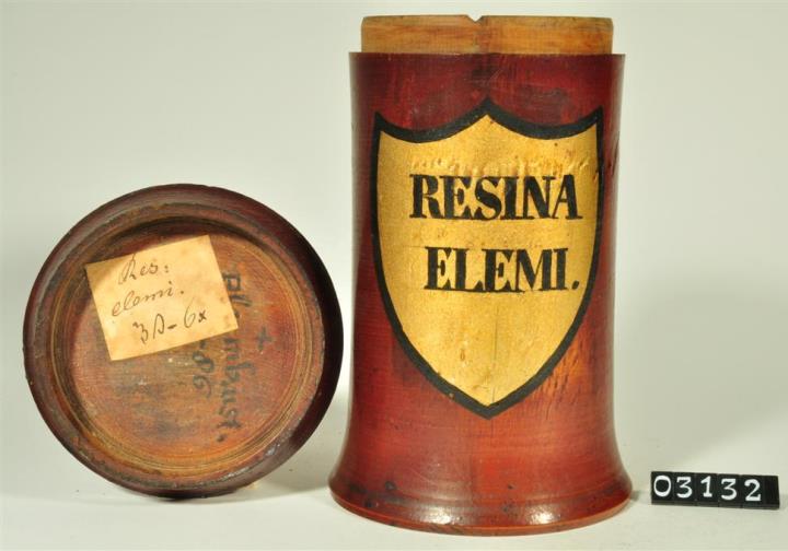 Braune, zylinderförmige Holzdose (Holzbüchse) mit ausgestelltem Standfuß und eingepaßtem, leicht gewölbtem Stülpdeckel und nach außen gebogenem Profil. Auf der Schauseite schildförmiges und goldfarbenes Beschriftungsfeld mit schwarzem Rand. Schwarz signiert