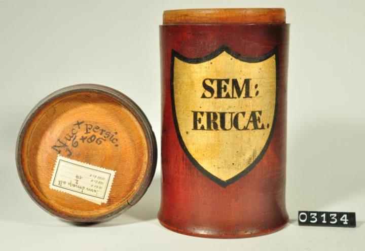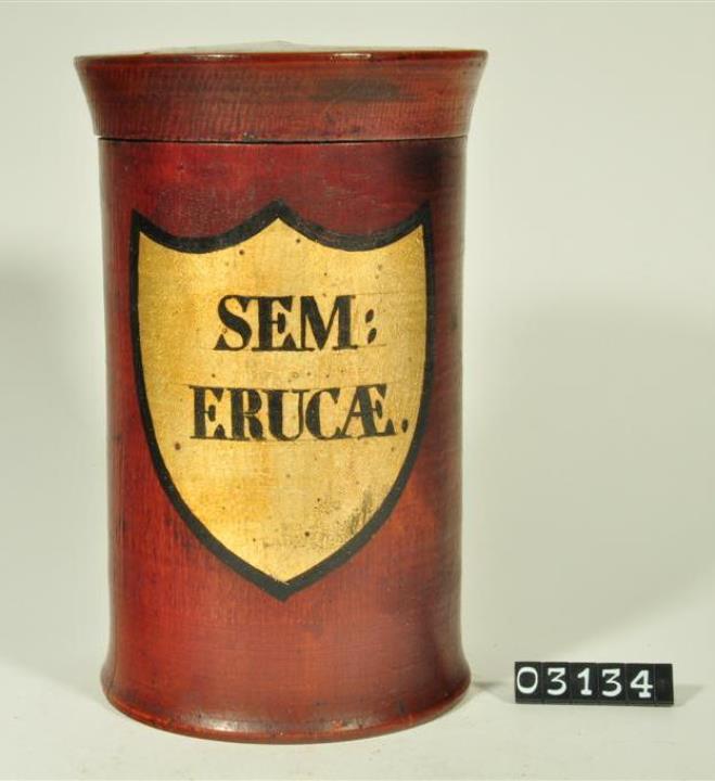 Braune, zylinderförmige Holzdose (Holzbüchse) mit ausgestelltem Standfuß und eingepaßtem, flachem Stülpdeckel und nach außen gebogenem Profil. Auf der Schauseite schildförmiges und goldfarbenes Beschriftungsfeld mit schwarzem Rand. Schwarz signiert. Enthielt Senfsamen.