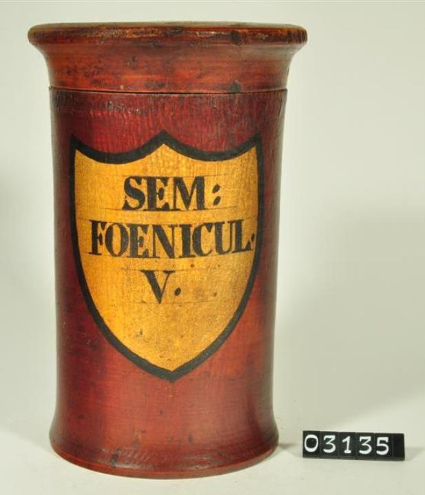 Braune, zylinderförmige Holzdose (Holzbüchse) mit ausgestelltem Standfuß und eingepaßtem, flachem Stülpdeckel und nach außen gebogenem Profil. Auf der Schauseite schildförmiges und goldfarbenes Beschriftungsfeld mit schwarzem Rand. Schwarz signiert