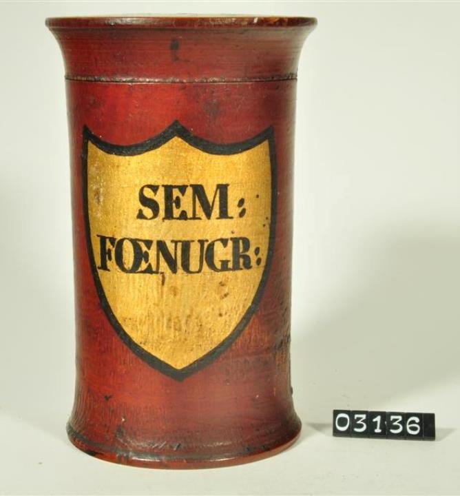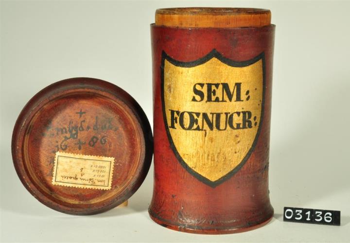 Braune, zylinderförmige Holzdose (Holzbüchse) mit ausgestelltem Standfuß und eingepaßtem, flachem Stülpdeckel und nach außen gebogenem Profil. Auf der Schauseite schildförmiges und goldfarbenes Beschriftungsfeld mit schwarzem Rand. Schwarz signiert