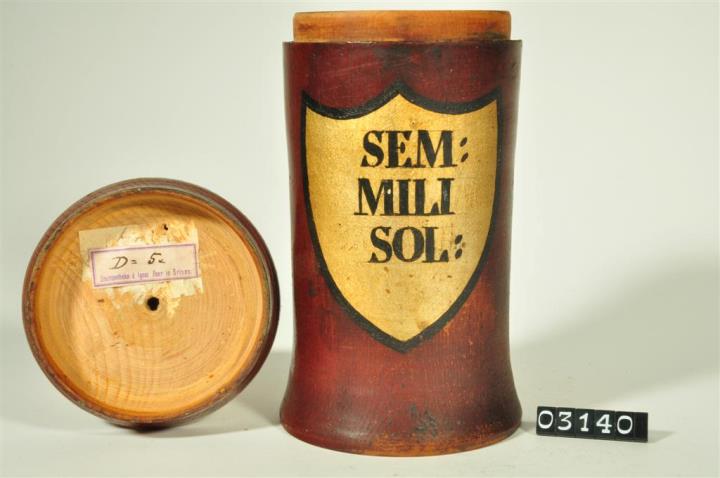 Braune, zylinderförmige Holzdose (Holzbüchse) mit ausgestelltem Standfuß und eingepaßtem, flachem Stülpdeckel und nach außen gebogenem Profil. Auf der Schauseite schildförmiges und goldfarbenes Beschriftungsfeld mit schwarzem Rand. Schwarz signiert
