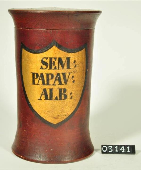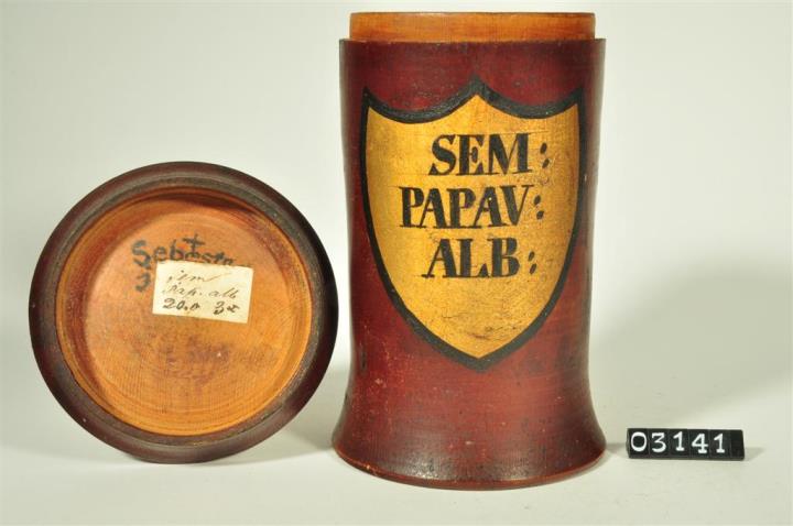Braune, zylinderförmige Holzdose (Holzbüchse) mit ausgestelltem Standfuß und eingepaßtem, flachem Stülpdeckel und nach außen gebogenem Profil. Auf der Schauseite schildförmiges und goldfarbenes Beschriftungsfeld mit schwarzem Rand. Schwarz signiert