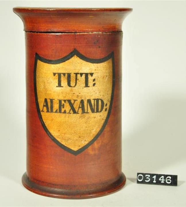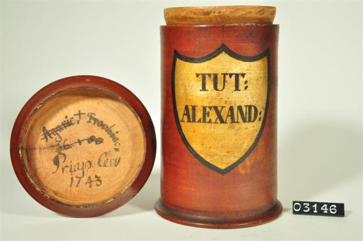 Braune, zylinderförmige Holzdose (Holzbüchse) mit ausgestelltem Standfuß und eingepaßtem, flachem Stülpdeckel und nach außen gebogenem Profil. Auf der Schauseite schildförmiges und goldfarbenes Beschriftungsfeld mit schwarzem Rand. Schwarz signiert