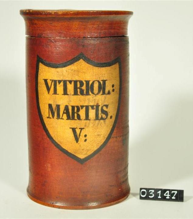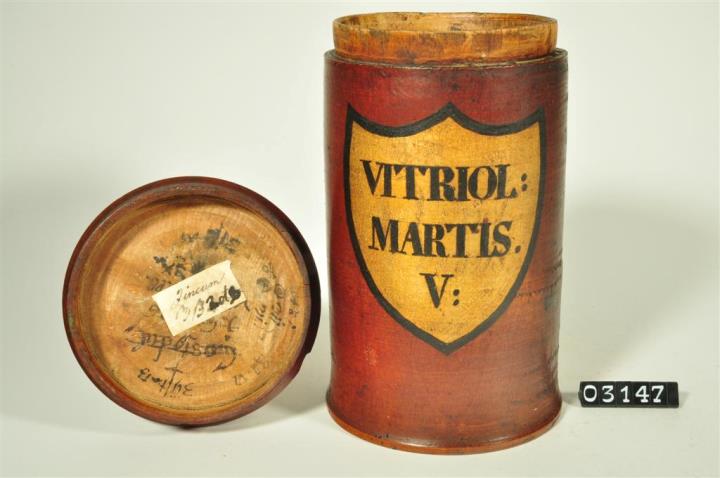 Braune, zylinderförmige Holzdose (Holzbüchse) mit ausgestelltem Standfuß und eingepaßtem, flachem Stülpdeckel und nach außen gebogenem Profil. Auf der Schauseite schildförmiges und goldfarbenes Beschriftungsfeld mit schwarzem Rand. Schwarz signiert