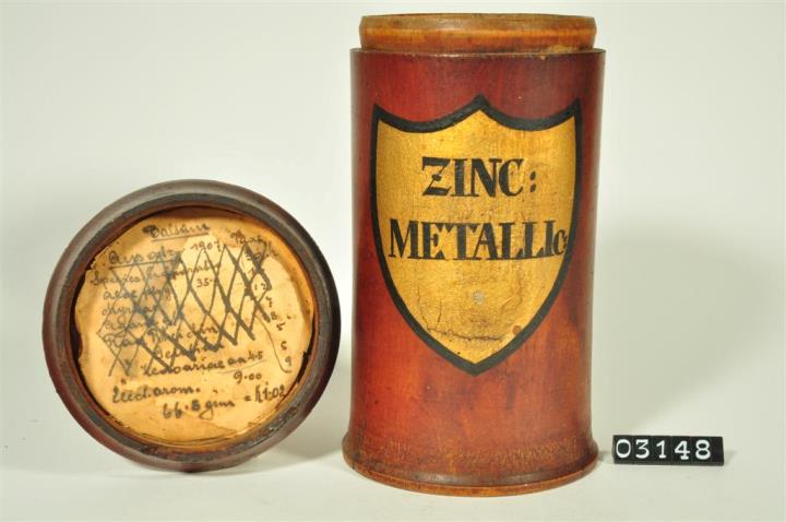 Braune, zylinderförmige Holzdose (Holzbüchse) mit ausgestelltem Standfuß und eingepaßtem, flachem Stülpdeckel und nach außen gebogenem Profil. Auf der Schauseite schildförmiges und goldfarbenes Beschriftungsfeld mit schwarzem Rand. Schwarz signiert. Innen mundgeblasene leere, kleine grünliche Glasflasche mit flacher Schulter, ausgebogenem Mündungsrand und hochgestochenem Boden; Korkstopfen.
