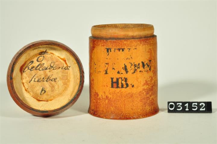 Braune, zylinderförmige Holzdose (Holzbüchse) mit ausgestelltem Standfuß und eingepaßtem, flachem Stülpdeckel mit Rille und nach außen gebogenem Profil. Schwarz signiert