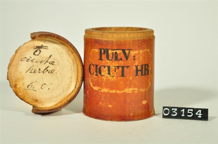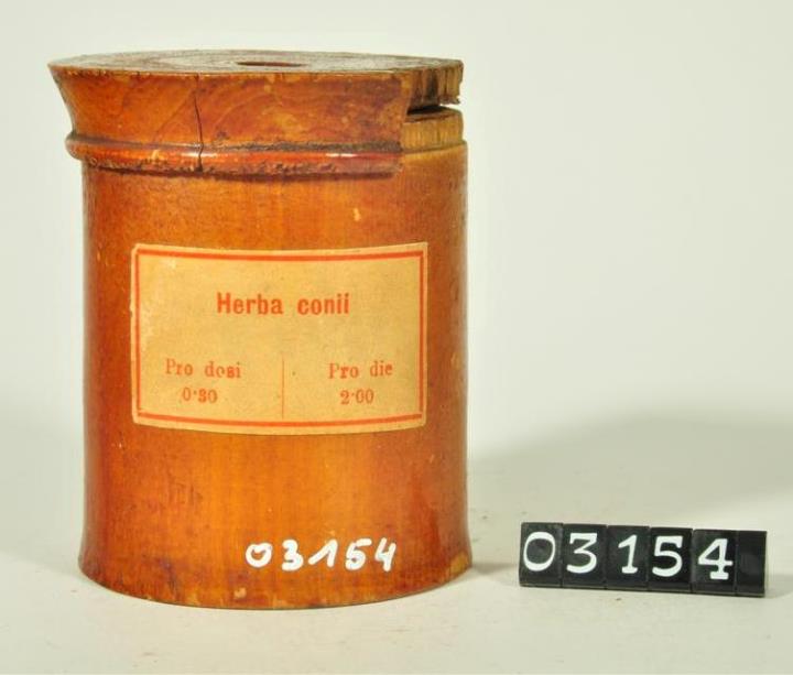 Braune, zylinderförmige Holzdose (Holzbüchse) mit ausgestelltem Standfuß und eingepaßtem, flachem Stülpdeckel mit Rille und nach außen gebogenem Profil. Schwarz signiert