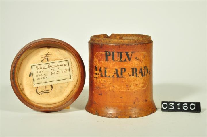Braune, zylinderförmige Holzdose (Holzbüchse) mit ausgestelltem Standfuß und eingepaßtem, flachem Stülpdeckel mit Rille und nach außen gebogenem Profil. Schwarz signiert
