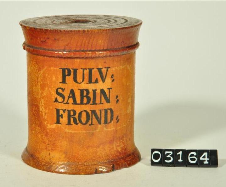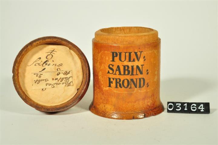 Braune, zylinderförmige Holzdose (Holzbüchse) mit ausgestelltem Standfuß und eingepaßtem, flachem Stülpdeckel mit Rille und nach außen gebogenem Profil. Schwarz signiert